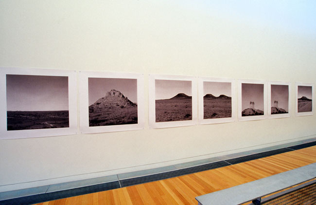 This series of landscape photographs were taken during my first trip to Alice Springs and Central Australia in 1994. My knowledge of country and culture was embryonic; my relationship to place, new and unknowable. The difference, the vastness, the remoteness, the scale, the space, the climate, the fearing, the desiring, the romanticising—all become part of a “repertoire of arrival” and other to the subjective self. This experience is repeated all over again when one encounters and enters into Aboriginal culture. My own fearing and desiring of this country, and its attendant Indigenous cultures, is hidden within this colonial/postcolonial framework. The empirical struggle over geography is mimicked by my own struggle into geography. To produce work within the colonial/postcolonial framework seemed a valid and safe beginning. It would take a long time to lose one’s self-consciousness with place and develop a knowledge and understanding in place—to learn a whole other knowledge system. Personally, Stereoscopic Histories developed into a satisfying conceptual form, one that enabled not only the possibility for a historic overview of place, but a point of entry into place. My own physical presence is compounded by a dense and traumatic historical context. I arrive after the fact and have to negotiate my way through this complex and contradictory historical paradigm—a virtual historic and cultural minefield.