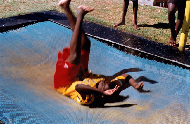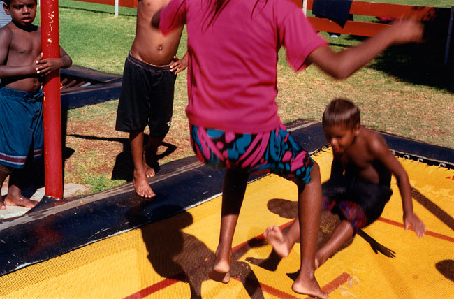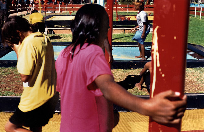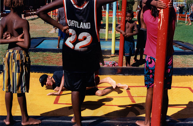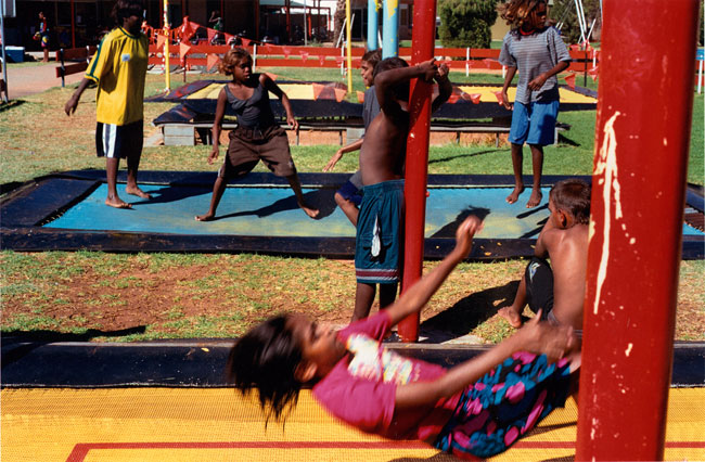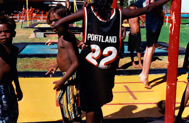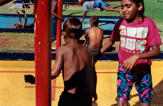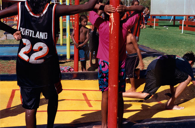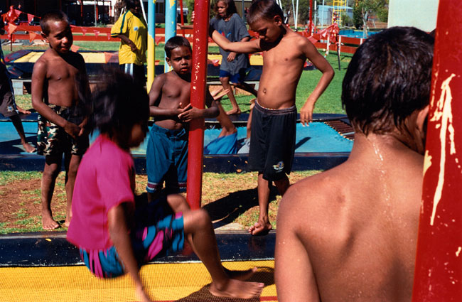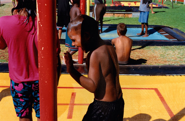 The local municipal pool entertains children and teenagers from multifarious language groups and communities—Yuendumu, Papunya, Kintore, Utopia, Ernabella, Fregon, Amata, etc. Local kids represent a cross-section of town camps, housing estates, township flats, and near-by traditional lands situated on the outskirts of Alice Springs. Yirara College, the local Lutheran boarding school, is a frequent pool regular. However, most of the children photographed in Pool are family and kin from Morris Soak, a town camp on the western outskirts of Alice Springs, together with their town relatives. Morris Soak is a mixture of Arrernte and Luritja language groups. Historically this is the camp where Albert Namatjira and his kin lived.