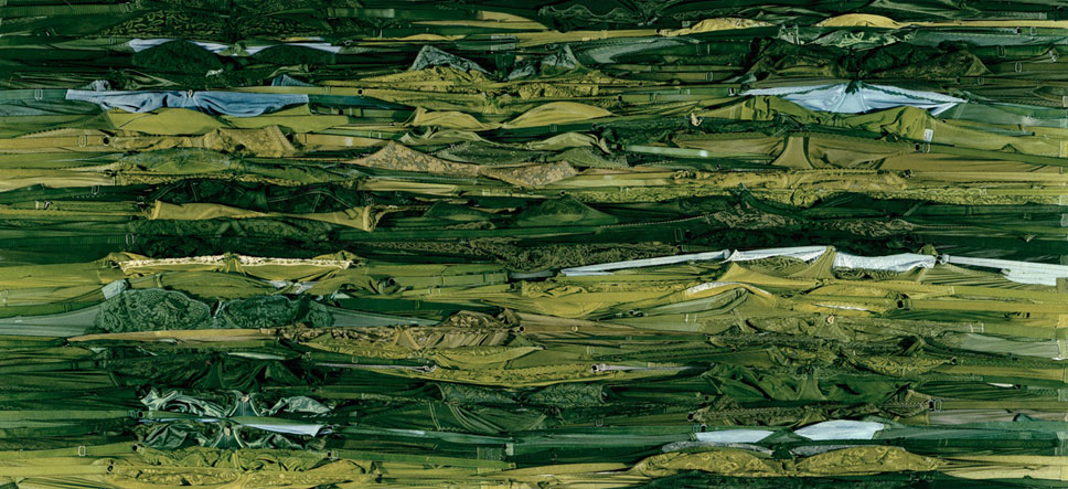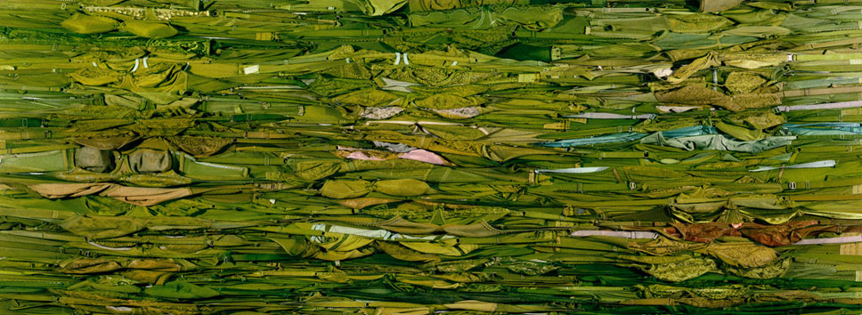Summer Rains is a suite of 12 large-scale photographic prints (or four epic works) each representing large tracts of country. Each work is made up of 3 panels (measuring 105.0cm x 250.0 and 127.0cm x 250.0cm) or, combined, 315.0cm x 250.0cm approximately. This suite of work represents the cyclic nature of summer and is entitled, December, January, February, and March. (December to March is the hottest time in Central Australia, as well as being the time of “business” for most Aboriginal language groups and their communities). Each panel is made up of hundreds of taut bras stretched across a flat plane field. This work refers to the symbolic transformation of country from parched, dry, yellow grasses (December) into the lush, green, and prolific living environment of life after the rains (March). The work insinuates the fecundity and fertility produced by exceptional rains, particularly after prolonged periods of little or no water. In Aboriginal life ways, stagnation is followed by fertility and the anticipation of bush foods, representing benevolence, nourishment, and continuity. Vast volumes of water flow into creek beds and rivers, permanent waterholes replenish, clay pans retain surface water for several months at a time, and temporary and permanent waterholes flourish and provide relief from the heat.